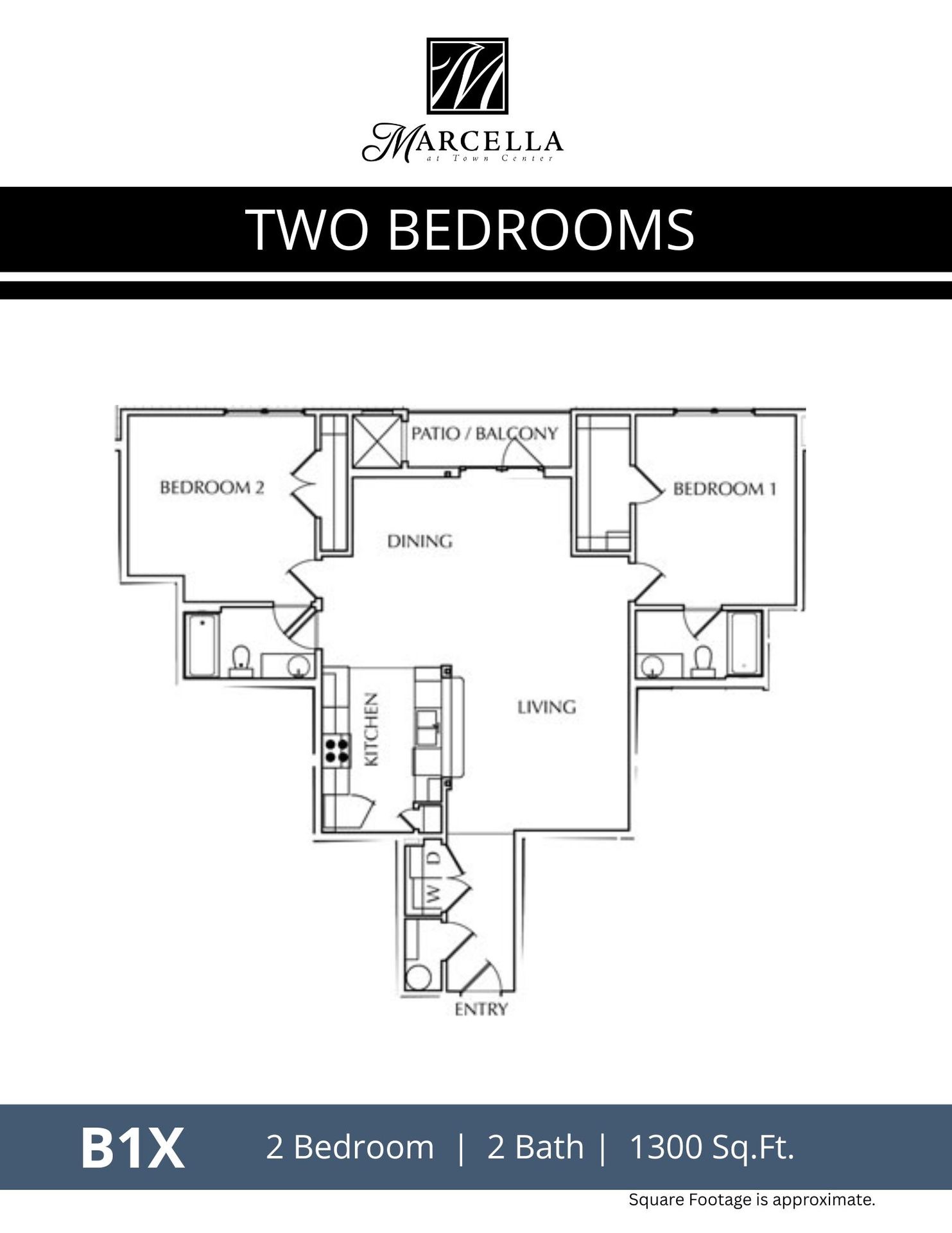 B1X | 2 Bed 2 Bath | 1300 sf | $1834 - $2,201 | 6 to 15 month lease terms