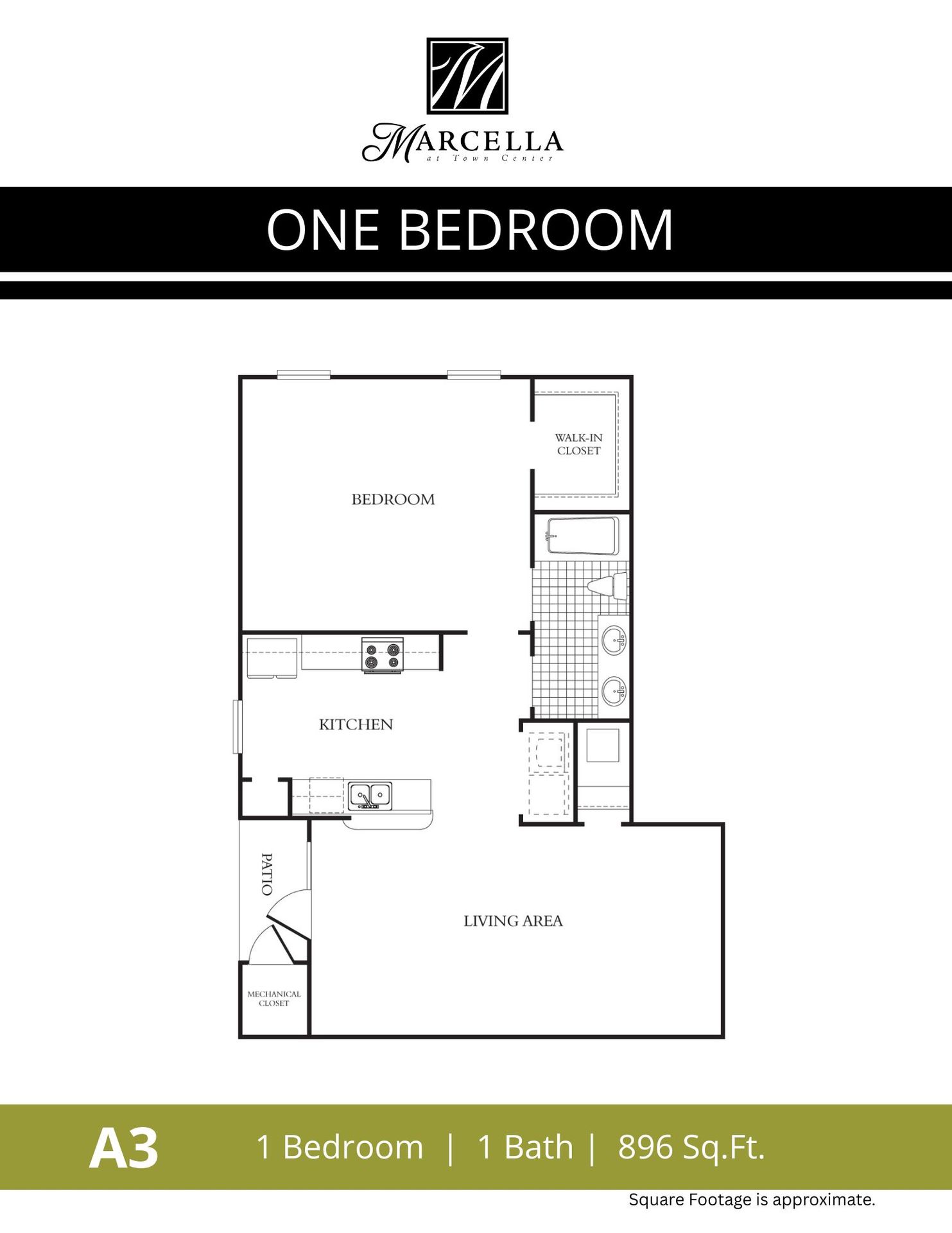 A3 | 1 Bed 1 Bath | 896 sf | $1574-$1889 | 6 to 15 month lease terms
