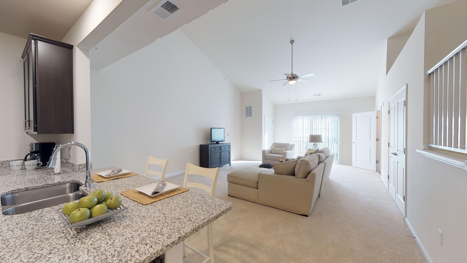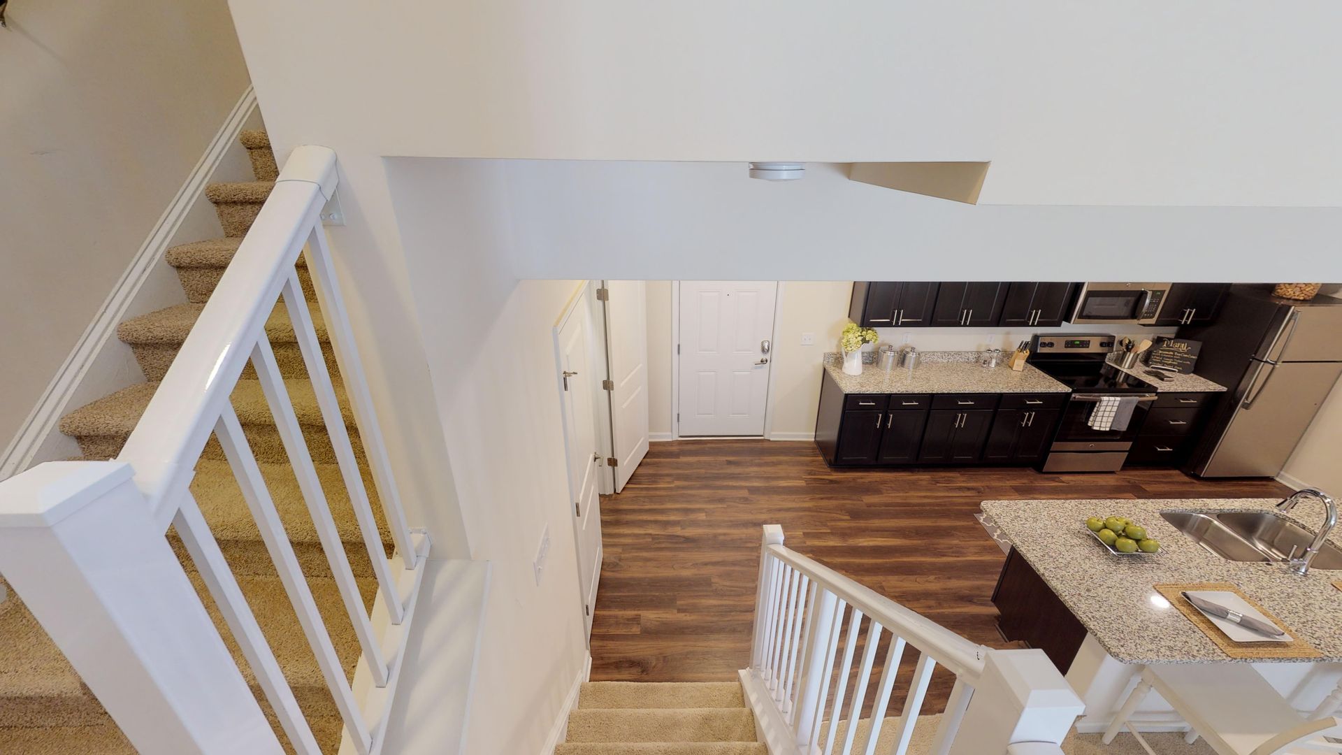 This apartment home features a large living and dining space, a separate bedroom upstairs in the loft with its own bathroom, and a full size washer & dryer. Other features are granite counter tops, stainless steel appliances and a half bath downstairs. Every apartment home has the luxury of valet trash removal, individual heating and cooling, and electronic entry.