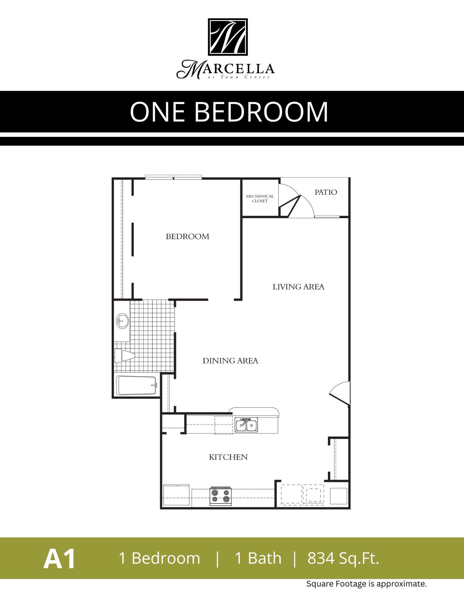 A1 | 1 Bed 1 Bath | 834 sf | $1564-$1877 | 6 to 15 month Lease Terms