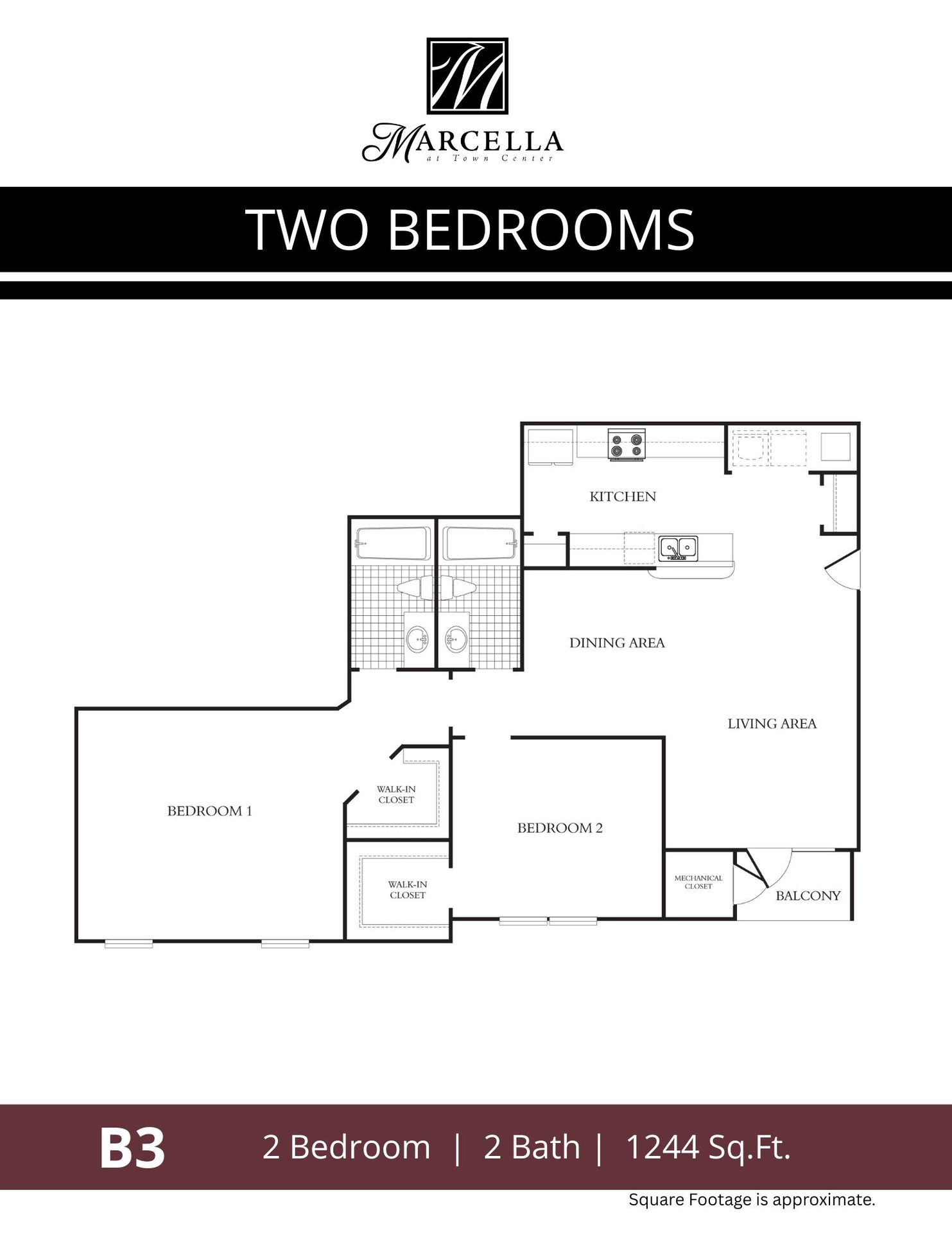 B3 | 2 Bed 2 Bath | 1244 sf | $1857 - $2228 | 6 to 15 month lease terms